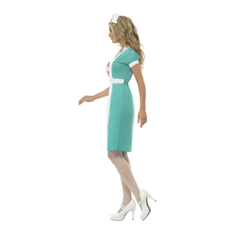 Costume d’infirmière du bloc opératoire, pour femme. Cet ensemble comprend une robe avec faux tablier et une coiffe. La robe est de couleur verte, le tablier blanc avec une croix rouge, assorti à la coiffe. Le tout est disponible en taille S, M ou L. La taille S offre une robe de taille 36-38, la M une robe 40-42 et la L une robe 44-46. C’est le déguisement parfait pour une soirée déguisée.