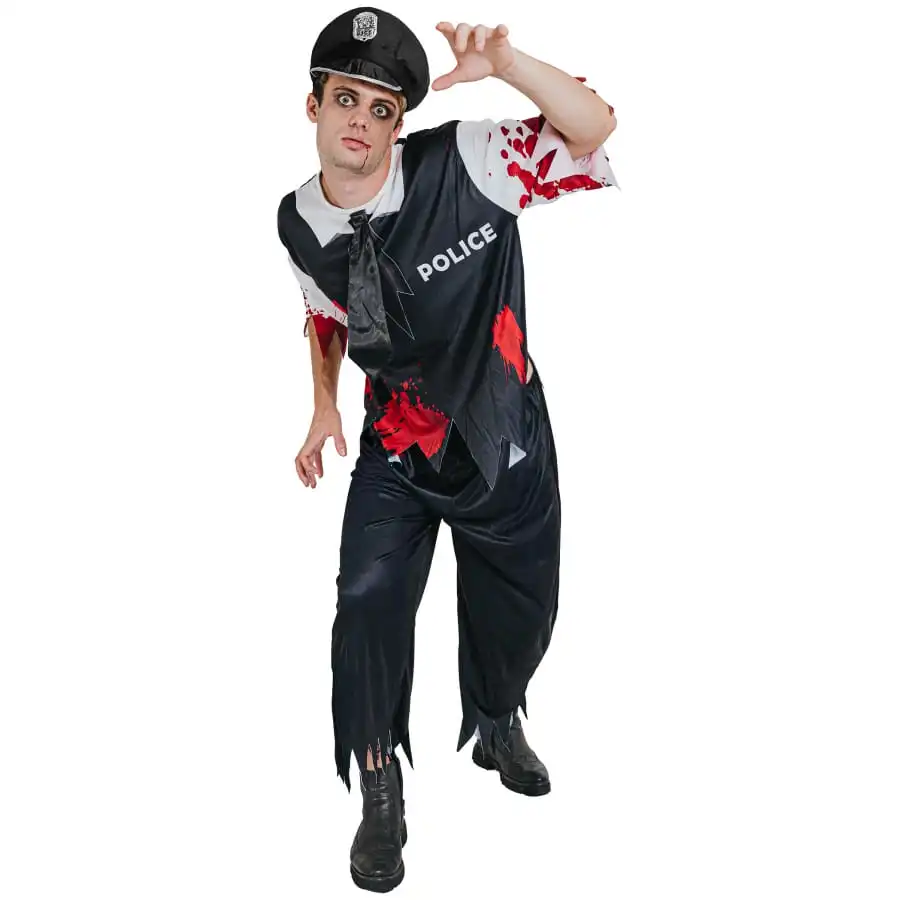 DĂ©guisement de policier zombie, pour homme, composĂ© d’un top et d’une cravate noirs avec fausse chemise blanche, d’un pantalon noir et d’un kĂ©pi assorti. L’ensemble est disponible en taille S, M ou L. Il est entièrement ensanglantĂ©. AssociĂ© au bon maquillage, vous serez un zombie parfaitement crĂ©dible.