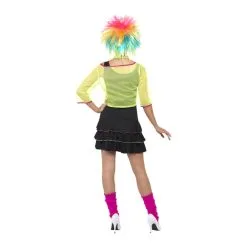 DĂ©guisement de pop star des annĂ©es 80, pour femme, composĂ© d’un top jaune fluo transparent, d’une robe noire et d’un bandeau en forme d’Ă©norme noeud fuschia. Le tout est disponible en taille S, M ou L. C’est un dĂ©guisement flashy et funky qui ne passera pas inaperçu.