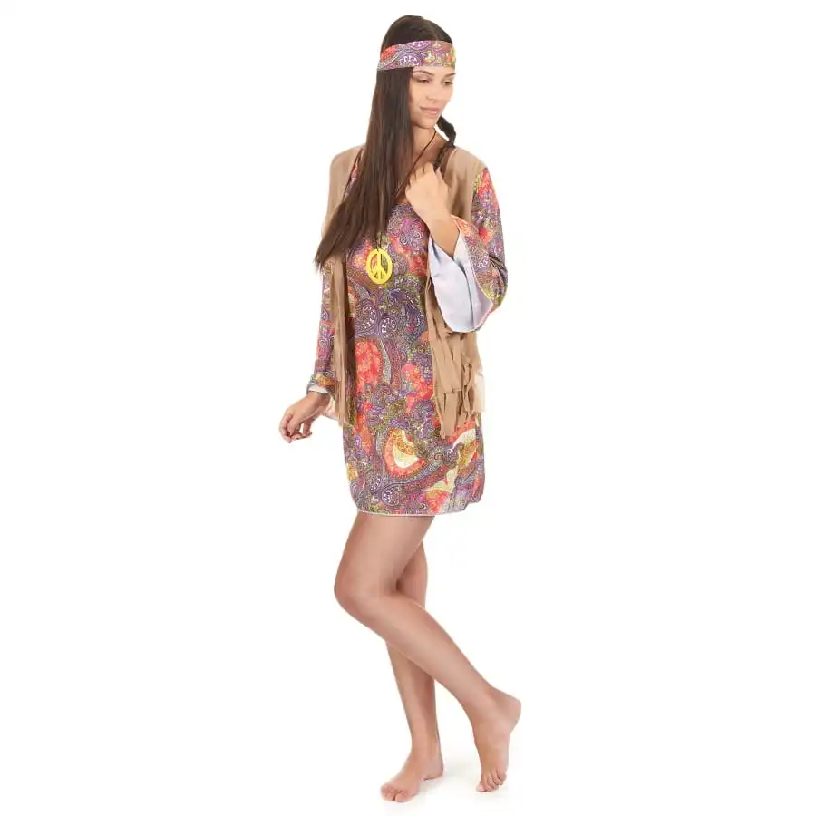Ce déguisement robe courte petits motifs hippies est le costume parfait pour le carnaval ou les fêtes à thème.