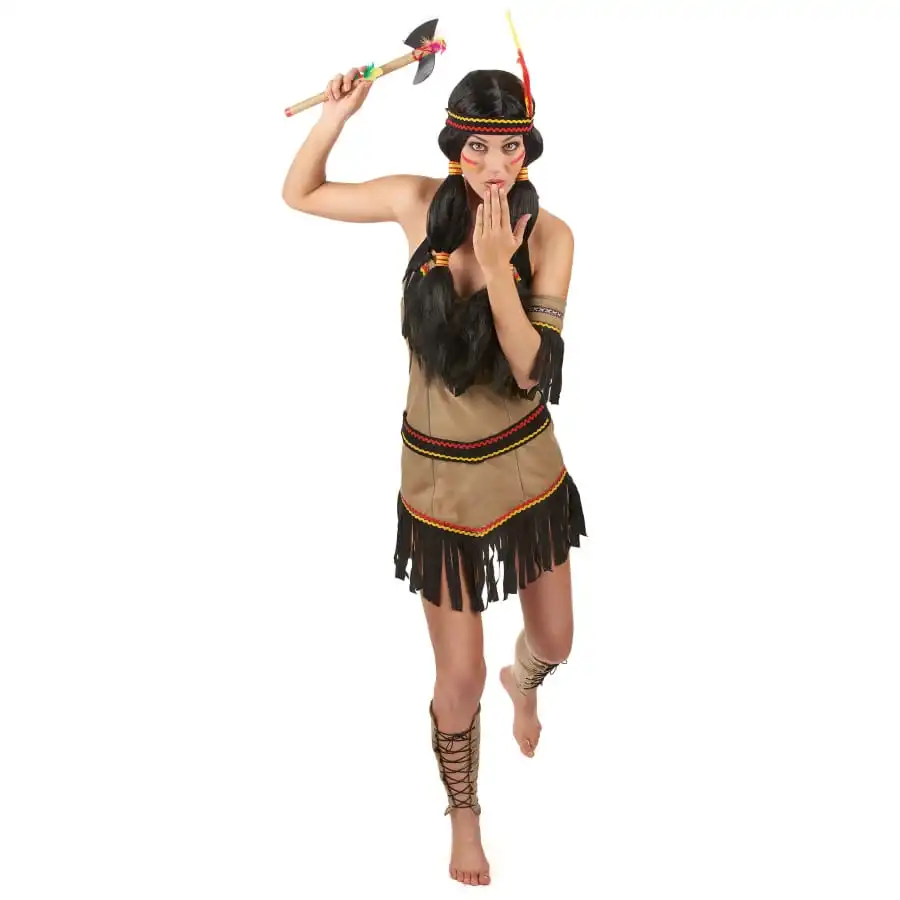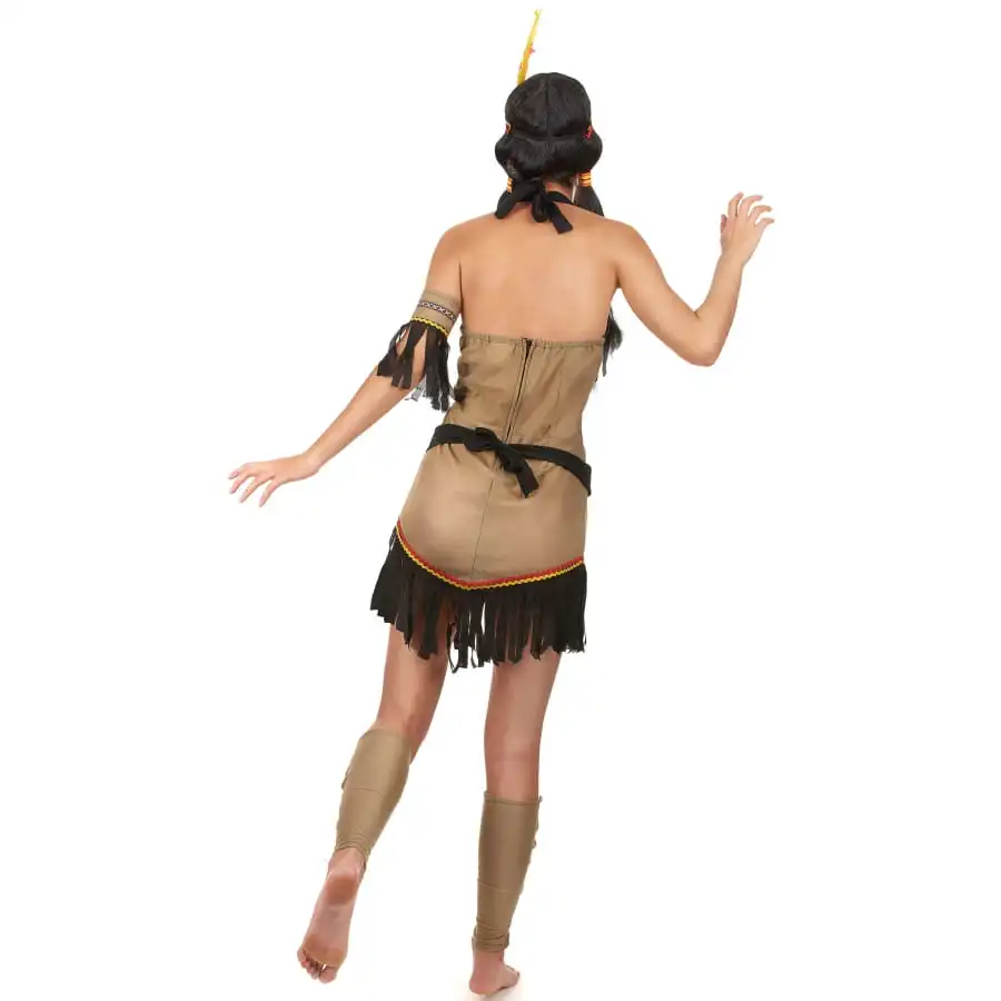 Ce déguisement robe d’indienne dos nu à franges est à adopter pour les femmes coquettes voulants se glisser dans la peau d’une indienne le temps d’une fête westernienne. Cette belle robe est de couleur marron, elle est dos nu et s’attache par le cou. Elle a l’avantage d’être faite dans un tissu élastique, ce qui lui permet de s’adapter à de nombreuses morphologies. Des motifs ornent la ceinture et le bas de la robe, également décoré de franges. Pour agrémenter les cheveux, un bandeau à plumes rouge et jaune est proposé, et le costume est complété par un tour de bras à franges et des jambières à lacets, qui sont donc réglables. Pour plus de réalisme, portez vos cheveux en nattes ou choisissez une perruque d’indienne parmi nos accessoires.