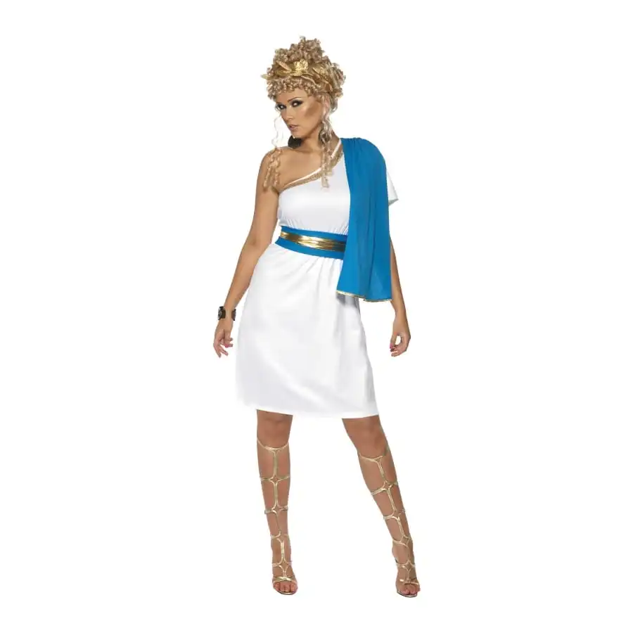 Déguisement de sénatrice romaine, pour femme, composé d’une robe blanche à bordure dorée, d’une roge bleu ciel, d’une ceinture dorée et bleue et d’une couronne en lauriers dorés. Cet ensemble est disponible en taille S, M ou L. Affirmez votre pouvoir en tant que figure historique et politique d’origine grecque ou romaine.
