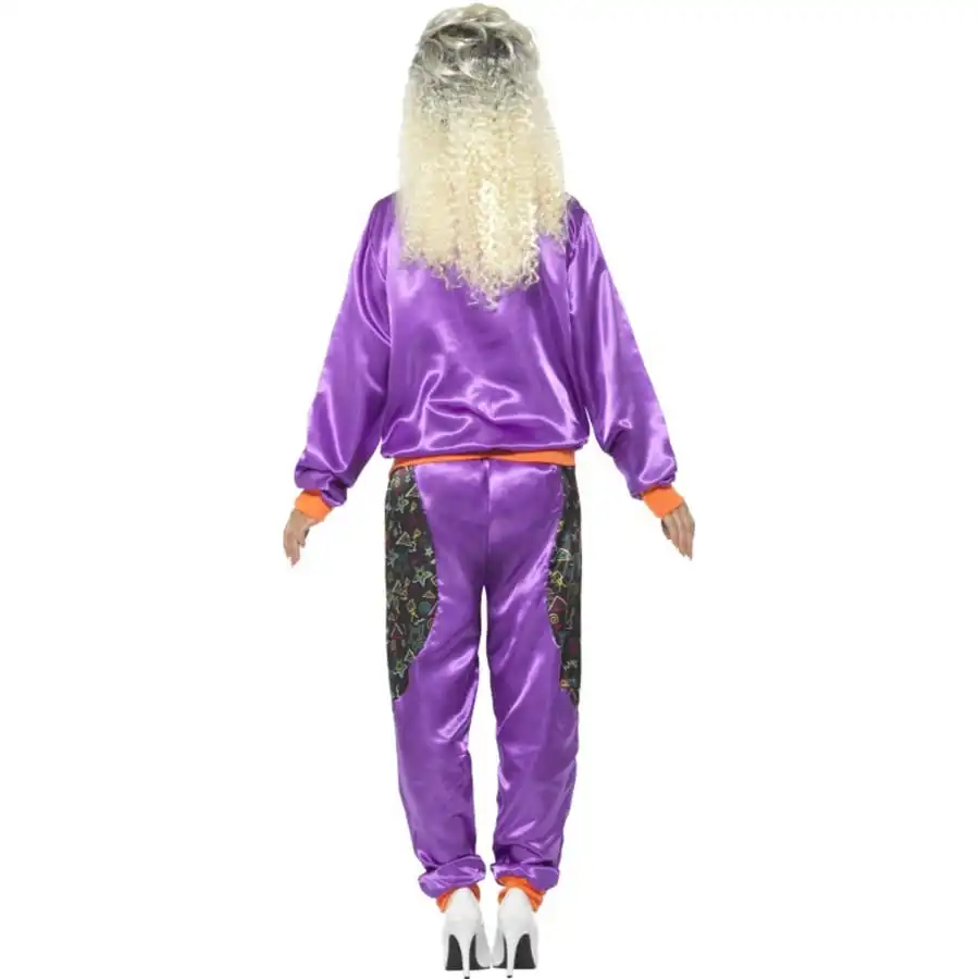 Une petite note d’humour dans un look des seventies, pourquoi pas ? Une vraie sportive va mettre de l’ambiance à un enterrement de vie de célibataire ! Enfilez sans plus attendre votre déguisement training rétro violet brillant, femme. Il s’agit d’un ensemble de couleur violet et orange avec quelques motifs rétro en prime. Vous disposerez d’un pantalon et d’une veste à manches longues, tous deux très légers et agréables à porter. Avec des talons ou des tennis, cette tenue fera de vous le coach parfait pour animer une piste de danse. Elle est idéale pour une soirée disco, notamment si vous y ajoutez une grosse perruque style rétro. La reine du dancefloor est dans la place !