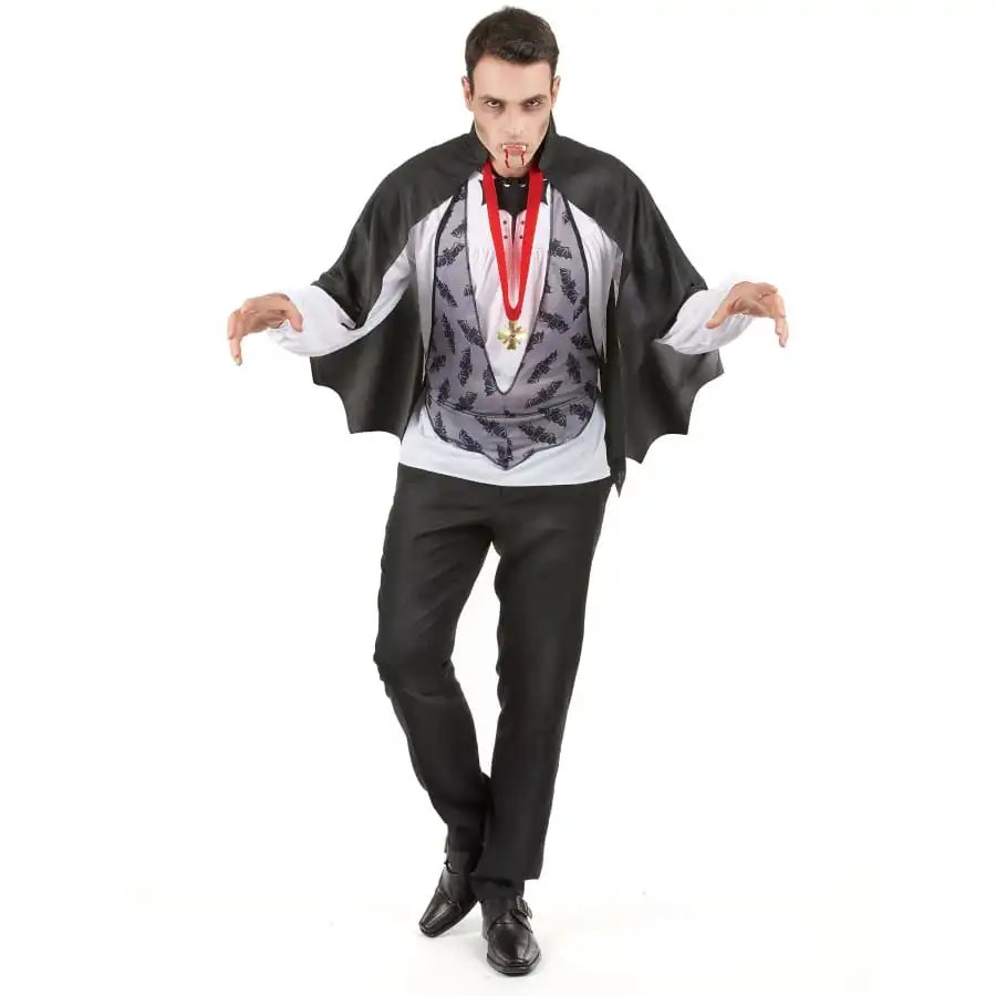 Messieurs, Ă l’occasion de la fĂŞte des morts, misez sur un costume original. Ainsi, nous vous proposons ce dĂ©guisement vampire chauve souris pour homme, disponible sur notre site. L’ensemble comprend une cape noire Ă col montant. Elle est faite de tissu fluide et s’inspire de la forme d’une aile de chauve-souris. Comptez aussi un noeud papillon noir afin de donner de la classe au costume. Un faux gilet de couleur violette, avec des imprimĂ©s chauve-souris, vient s’ajouter au reste. Pour couronner le tout, vous aurez droit Ă un pendentif dorĂ© suspendu Ă un cordon rouge. Avec ce dĂ©guisement vampire chauve souris pour homme, vous avez l’essentiel d’une vraie tenue d’halloween !