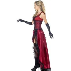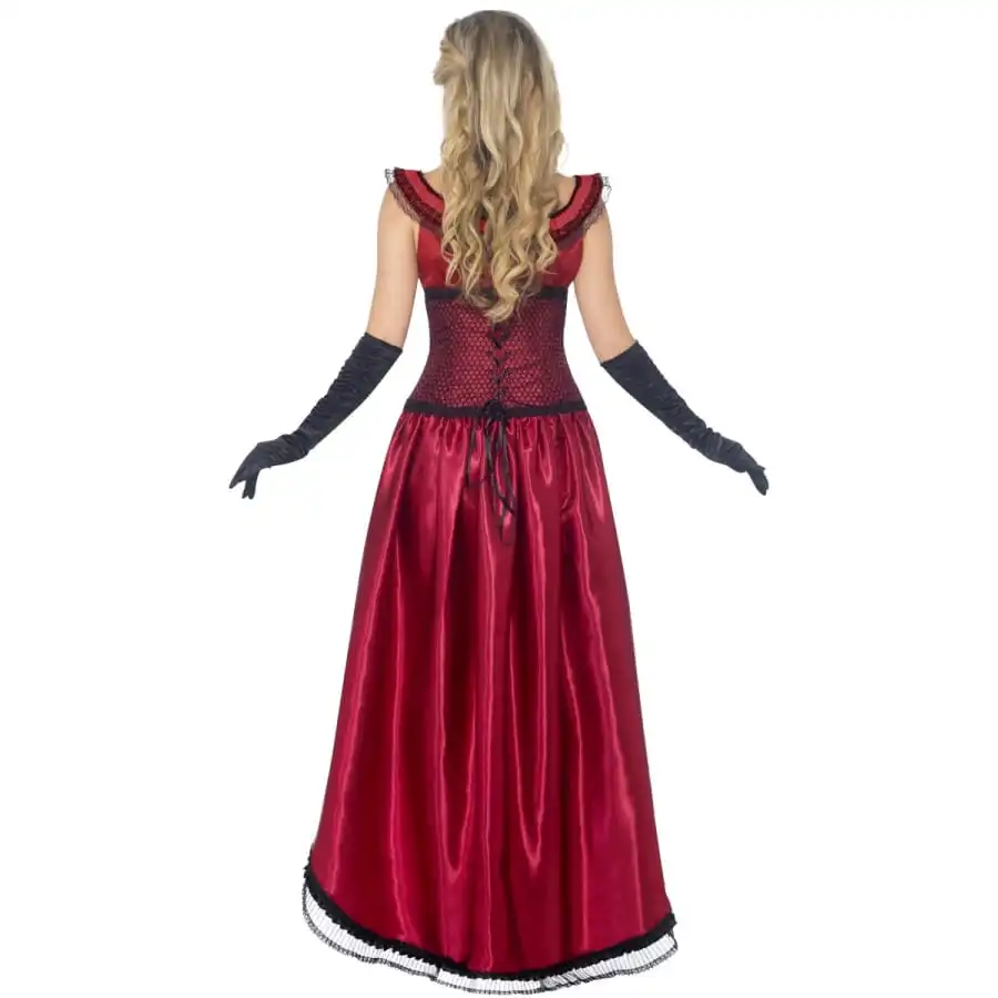 DĂ©guisement Western, pour femme, composĂ© d’une magnifique robe rouge et noire et d’un corset assorti. Le jupon de la robe est court devant et long Ă l’arrière. e tout est ornĂ© de volants, de dentelles et d’un unique noeud. Ajoutez-y des gants et des bas et vous voilĂ femme de saloon typiquement Western. Vous pourrez choisir la taille de la tenue lors de la commande, entre un S, M ou L.