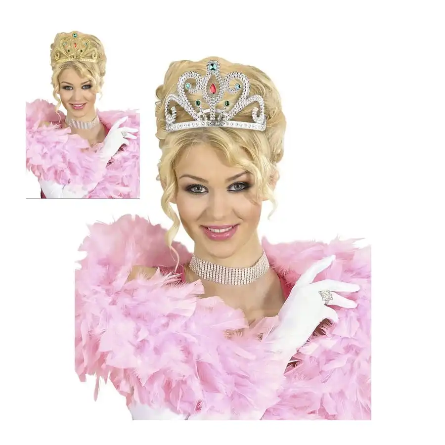 Il s’agit d’une tiare ornĂ©e de fausses pierres prĂ©cieuses multicolores incrustĂ©es en relief.