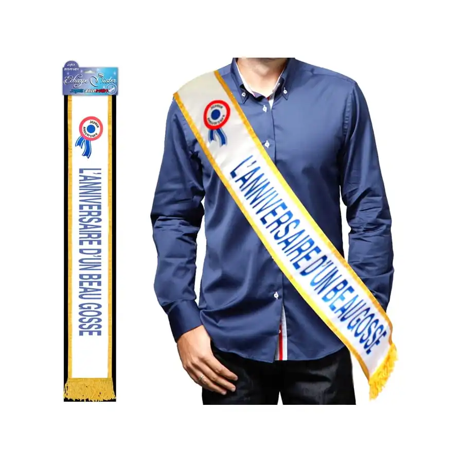 Le jour J est pour bientĂ´t ? FĂŞtez comme il se doit l’anniversaire de votre meilleur ami en lui offrant cette belle Ă©charpe l’anniversaire d’un beau gosse. Il la portera fièrement pendant sa surprise party et deviendra bien Ă©videmment le centre d’attention. L’Ă©charpe fait une longueur de 184 cm. Elle est formĂ©e par un tissu blanc aux liserĂ©s dorĂ©s. L’inscription “l’anniversaire d’un beau gosse” y a Ă©tĂ© imprimĂ© en gros caractères dans la couleur bleu pailletĂ©.