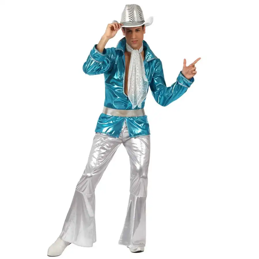 ApprĂŞtez-vous Ă devenir cĂ©lèbre lors d’une soirĂ©e rĂ©tro. Votre look sera parfaitement appropriĂ© pour l’occasion avec cet ensemble disco bleu brillant pour homme. L’article comprend un ensemble haut et pantalon style annĂ©es 70. Le haut est Ă©quipĂ© de longues manches. Il est dotĂ© d’un col de chemise et s’ouvre sur le devant. Le vĂŞtement a Ă©tĂ© conçu dans un tissu de couleur bleue Ă effet brillant. Quant au pantalon, il est Ă©lastique Ă la taille. Il s’agit d’un modèle Ă pattes d’Ă©lĂ©phant de couleur gris argentĂ©. CĂ´tĂ© accessoires, une ceinture de couleur grise viendra entourer la taille, tandis qu’un foulard gris viendra se nouer autour de votre cou.
