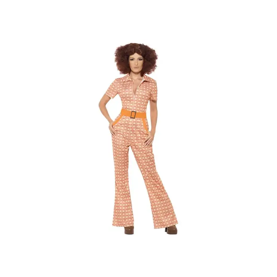 Vous vous souvenez sĂ»rement de ces combinaisons tube ou patte d’Ă©lĂ©phant, très en vogue dans les annĂ©es 70, et qui aujourd’hui rappellent immĂ©diatement cette Ă©poque. Et bien, nous l’avons dĂ©gotĂ©e pour vous, Mesdames, et nous vous proposons cet ensemble Ă motif des annĂ©es 70 pour femme. Cet ensemble est reprĂ©sentĂ© par la fameuse combinaison Ă pantalon, possĂ©dant une grande encolure pointue et des manches courtes. CintrĂ©e pour bien vous mettre en valeur, cette combinaison est Ă pattes d’Ă©lĂ©phant vers le bas. Elle est ornĂ©e de motifs de couleur orange et s’ouvre avec une fermeture sur le devant. Les tailles dont nous disposons pour ce dĂ©guisement sont : L, M, S et XL.