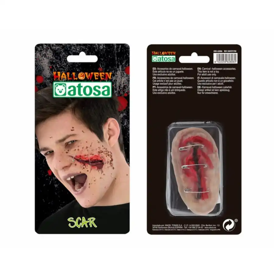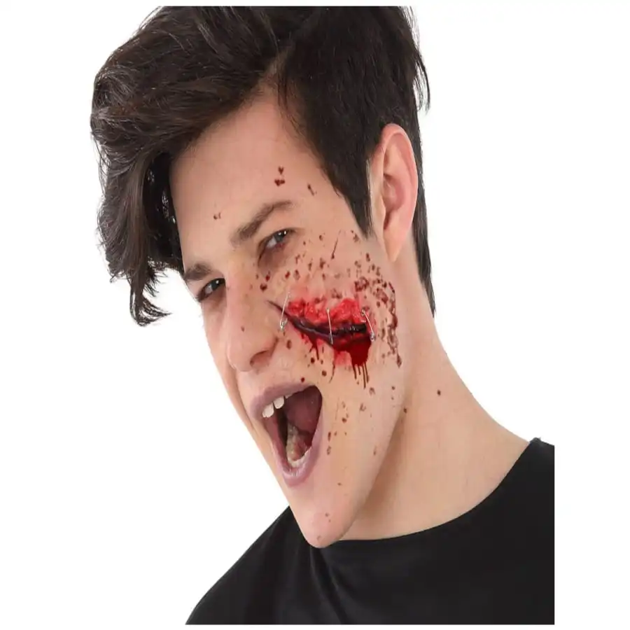Cette fausse plaie représente une blessure ouverte confectionnée à base de latex et que vous pourrez fixer sur votre joue par exemple, ou sur une autre partie visible de votre visage.