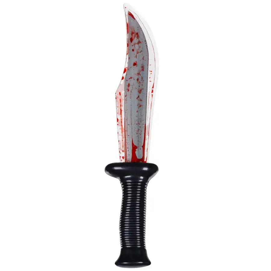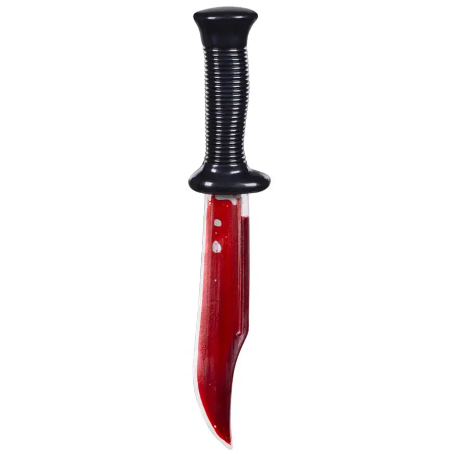Il possède un manche noir et une lame grise recouverte de sang factice.