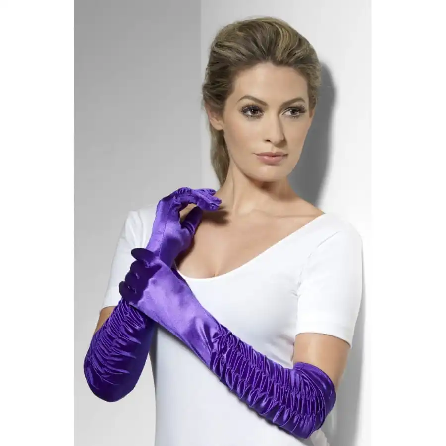 Paire de longs gants “tentatrice” de couleur violette, pour femme. Ces gants arrivent Ă la hauteur des coudes et est entièrement en satin. Les avant-bras sont froissĂ©s et ils donnent une apparence très glamour, parfaite pour un dĂ©guisement de sĂ©ductrice.