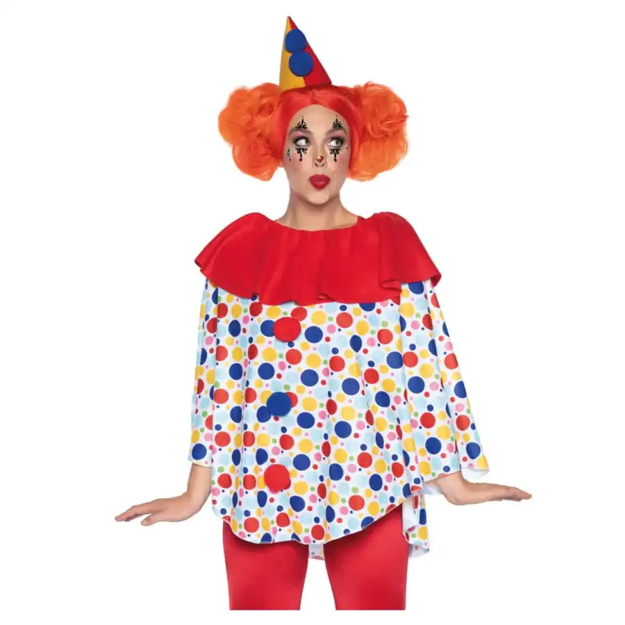 Faites le clown pour le plus grand bonheur des invitĂ©s d’une soirĂ©e humour, avec le haut blanc et colorĂ© de clown avec chapeau.