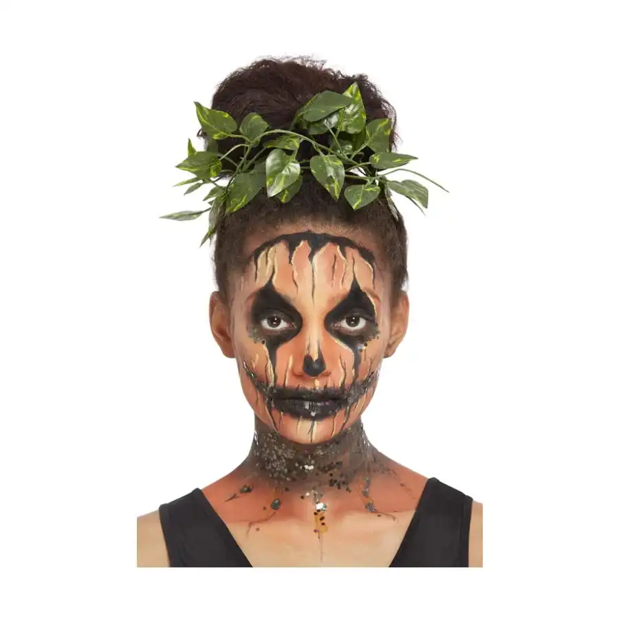 Des fausses feuilles vertes disposées en couronne en complément de la coiffe qui se fixera sur vos cheveux.