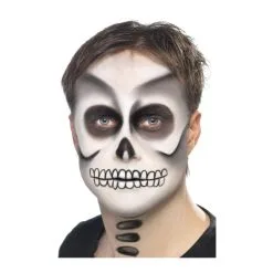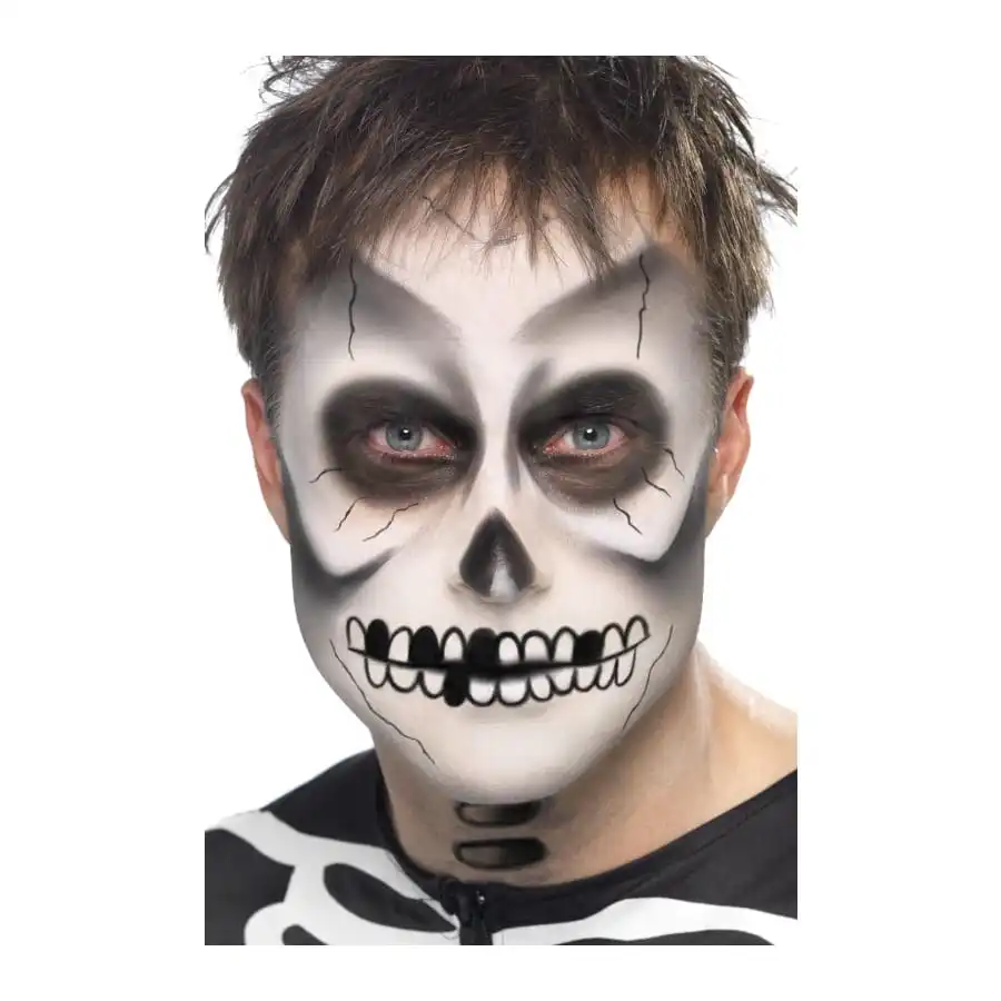 Kit de maquillage de squelette, pour homme ou femme, composĂ© de la palette de maquillage, d’une Ă©ponge et d’un crayon noir. N’hĂ©sitez pas Ă abuser des couleurs sombres afin de rendre votre maquillage encore plus rĂ©aliste et appropriĂ© pour Halloween.