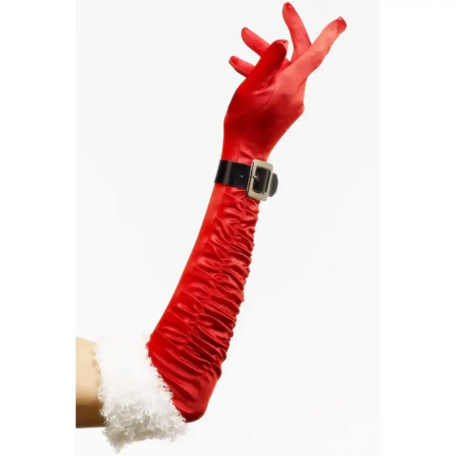 Longs gants blanc et rouge avec boucle noire. Cet accessoire est idĂ©al pour se transformer en Mère NoĂ«l pour les fĂŞtes de fin d’annĂ©e.