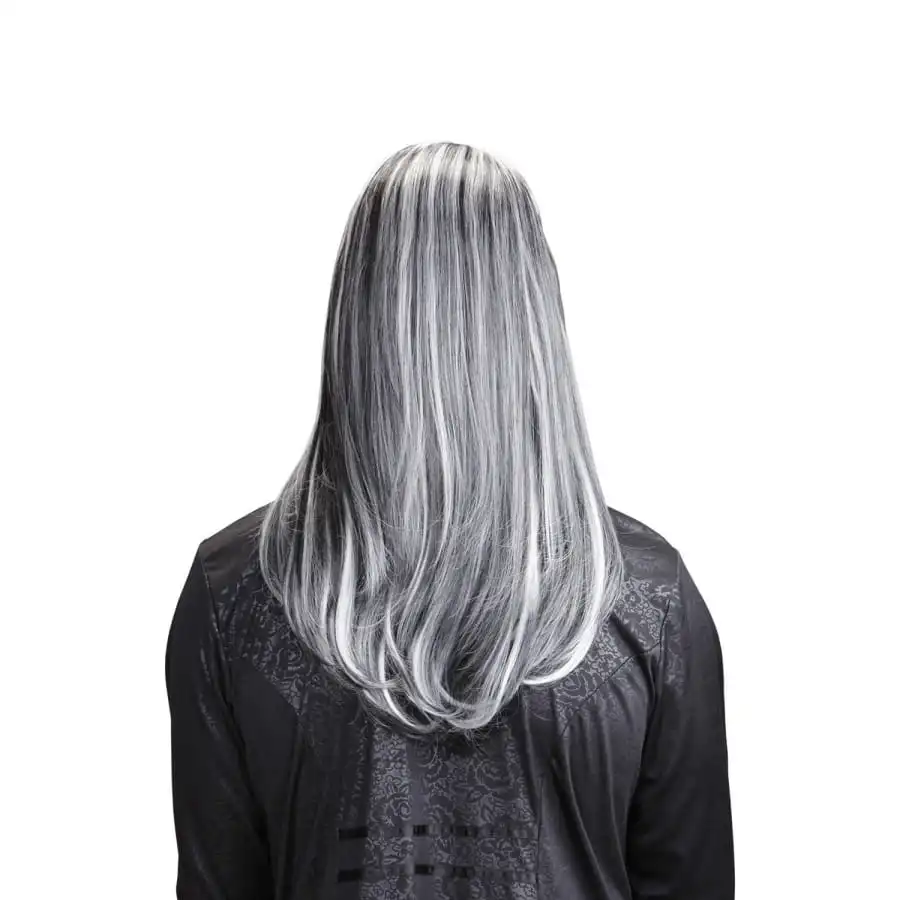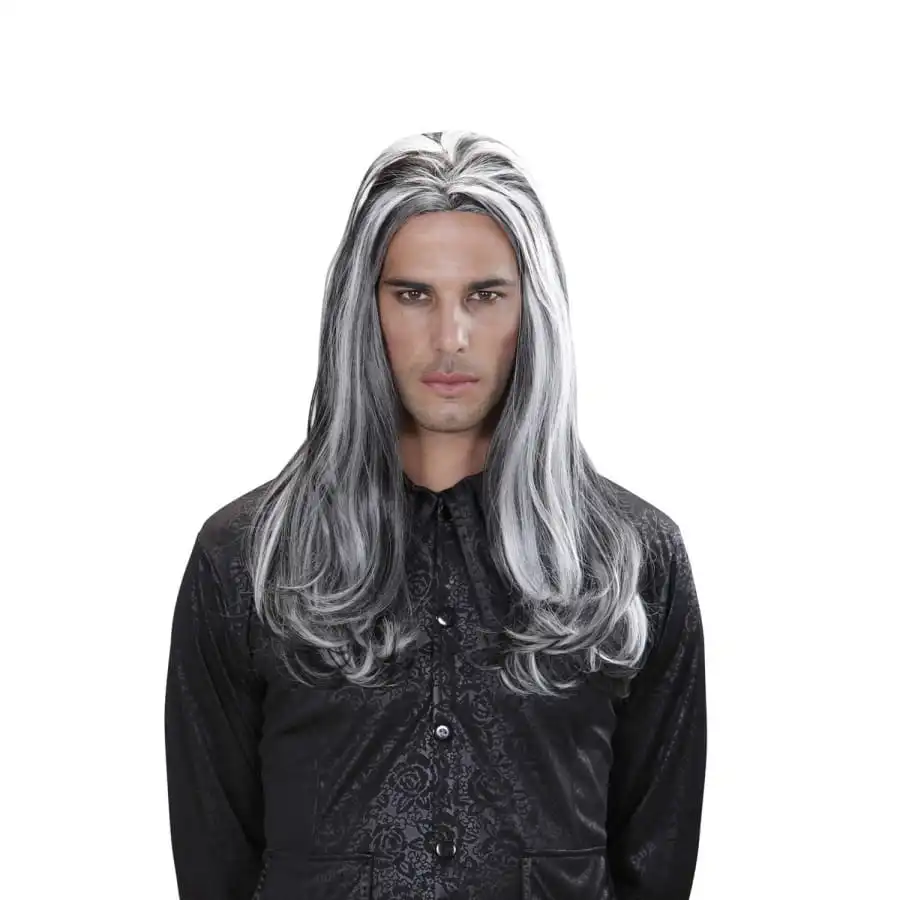 La longue perruque blanche et noire de vampire est le complĂ©ment idĂ©al pour un costume de vampire lors d’une fĂŞte sur le thème de l’horreur.