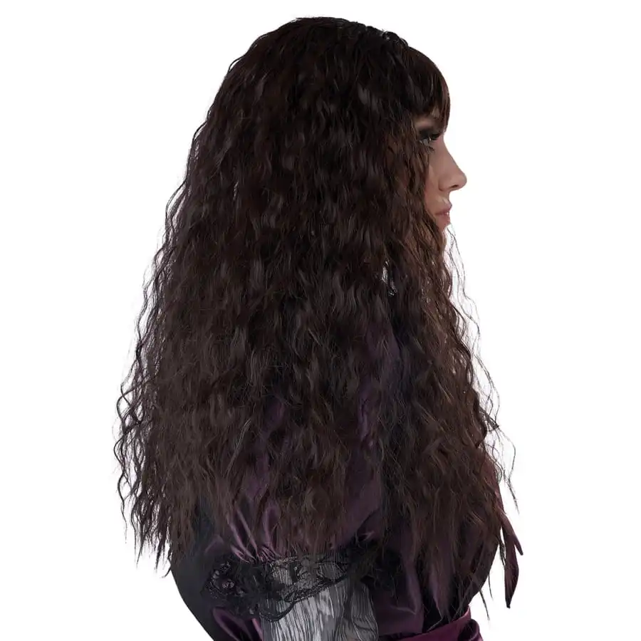 Il s’agit d’une perruque constituĂ©e de longues mèches de cheveux synthĂ©tiques.