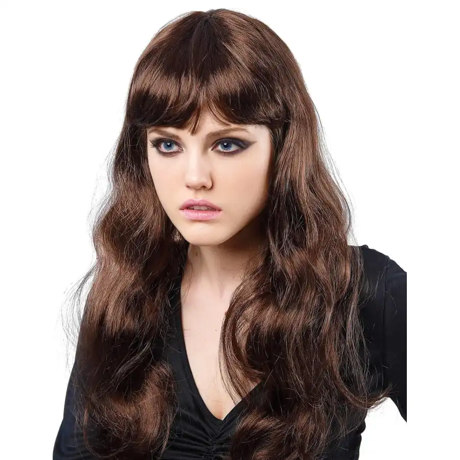 Notre longue perruque châtain ondulée et frange est une coiffure aux longues mèches synthétiques très proches du naturel.