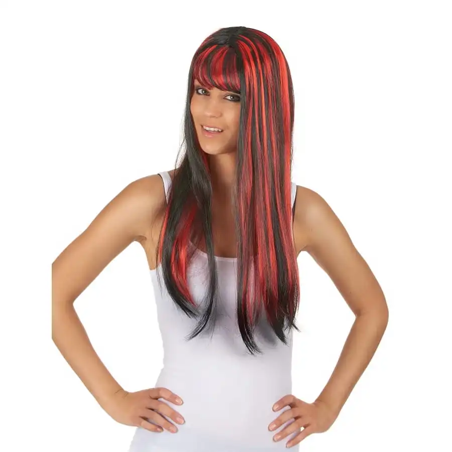 Si vous voulez changer de tĂŞte le temps d’un carnaval ou d’une soirĂ©e dĂ©guisĂ©e, nul besoin d’aller chez le coiffeur, dĂ©couvrez cette longue perruque noire balayage rouge pour adulte.