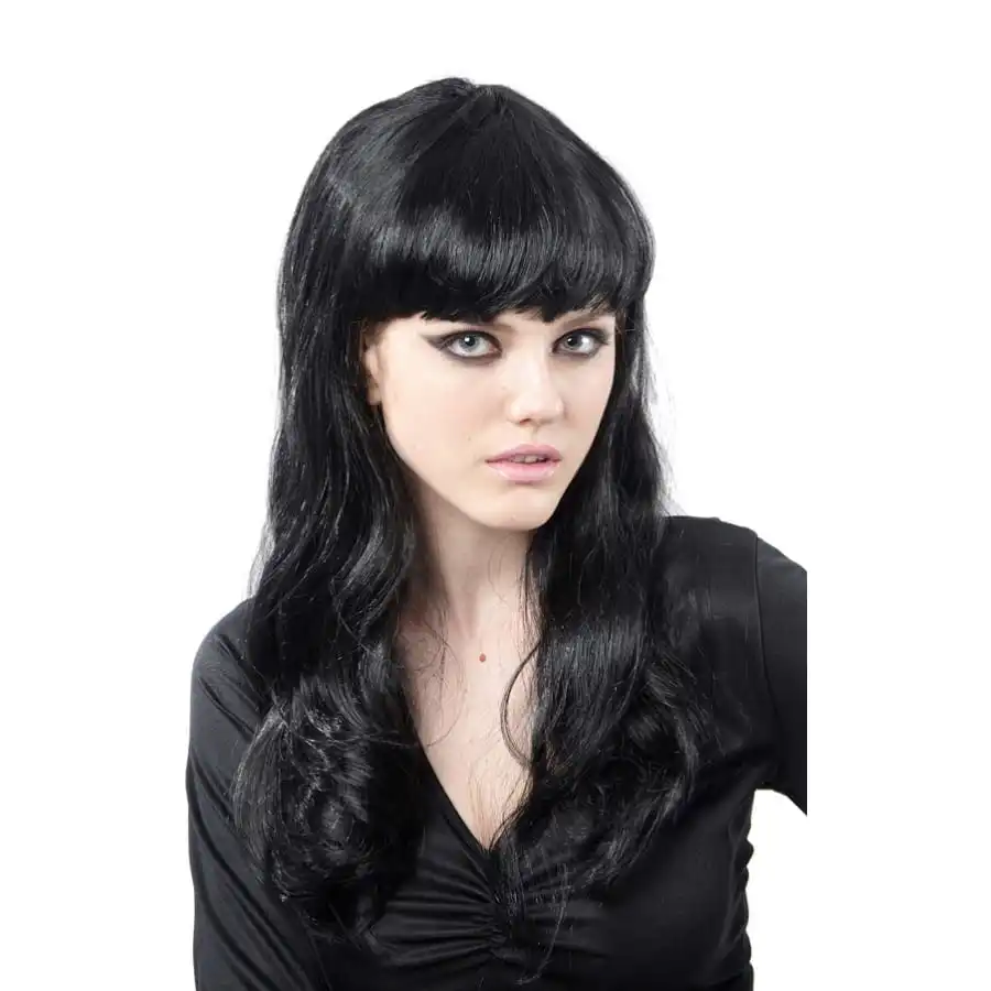 Cette longue perruque noire ondulĂ©e avec frange est l’accessoire rĂŞvĂ© pour toutes les apprenties sĂ©ductrices lors d’un bal costumĂ©.