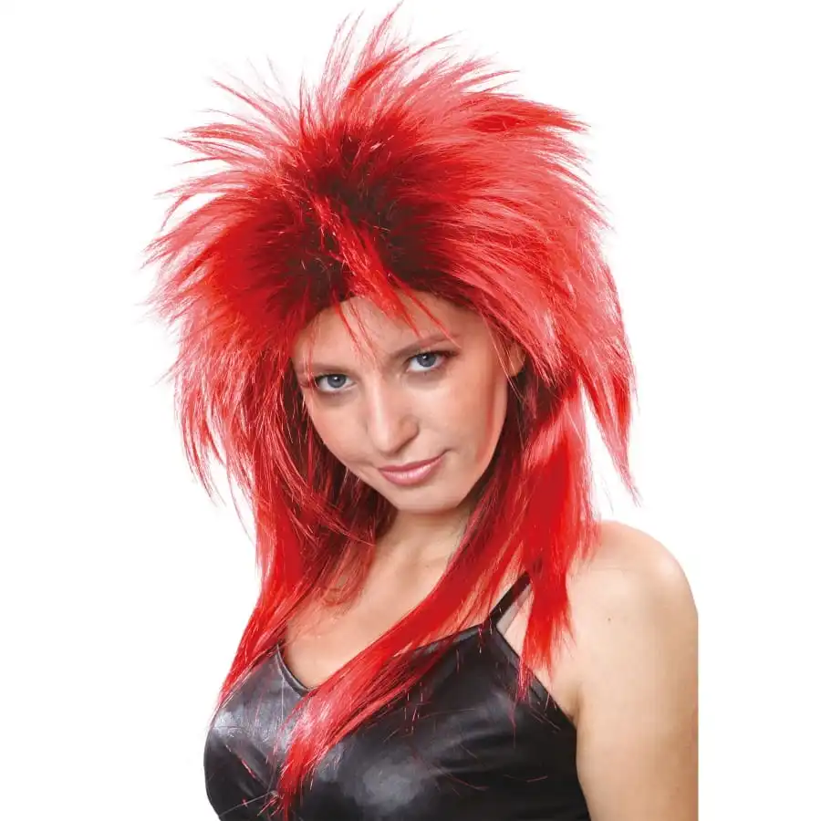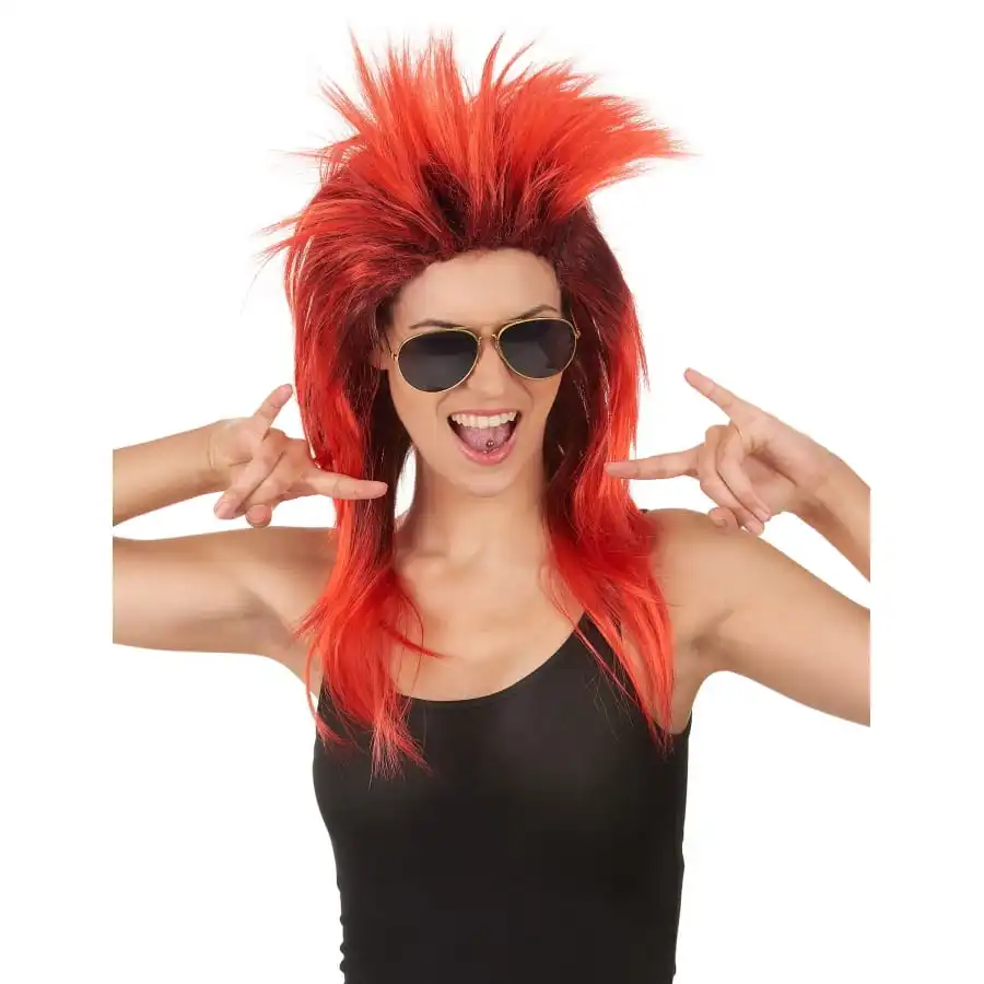 Pour un look rock’n roll rĂ©ussi, coiffez vous de cette longue perruque rock star rouge aux racines noires pour femme.