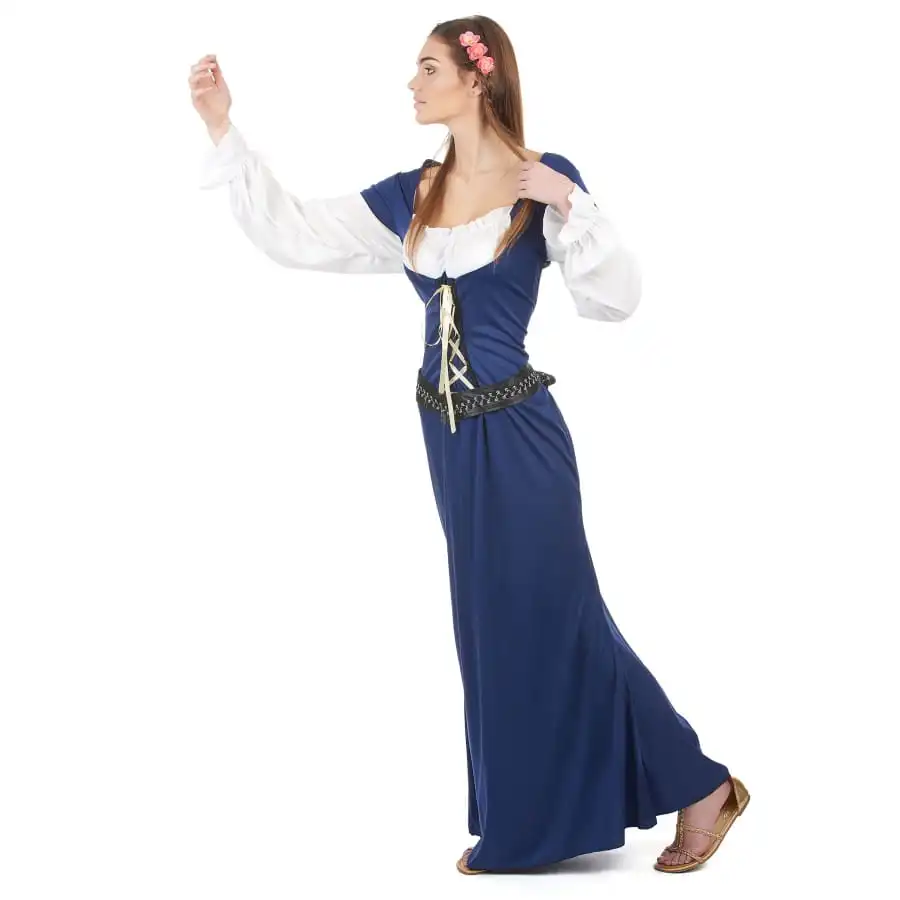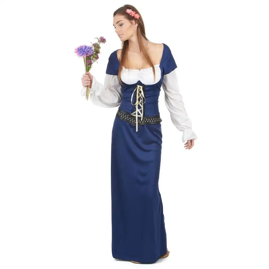 Avec cette longue robe bleue de bavaroise pour femme, mettez-vous dans la peau d’une belle Allemande pour l’une de vos soirĂ©es dĂ©guisĂ©es. La tenue est faite d’une fausse chemise blanche dĂ©colletĂ©e couvrant la poitrine, et d’une longue robe bleue marine avec des manches courtes. La robe est cintrĂ©e par un haut de type corset, qui se resserre avec un lacet dorĂ©, puis de longues manches blanches prolongent celles de la robe pour donner l’effet fausse chemise. Elle est dĂ©corĂ©e d’une ceinture noire tombante Ă la taille. Les fronces de la fausse chemise au niveau des poignets et de la poitrine donneront du charme Ă la tenue.