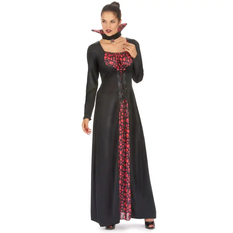 La longue robe de femme vampire imprimé têtes de mort.