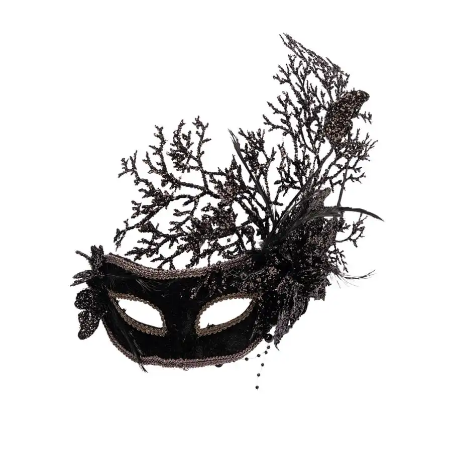 Ce Loup noir avec fleurs et branchages d’un côté sera parfait pour accessoiriser un costume de bal masqué sur le thème baroque.