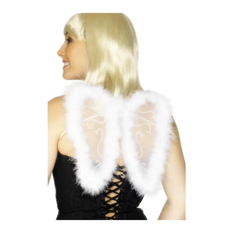 Paire de mini-ailes d’ange de couleur blanche pour femme. Ces ailes sont transparentes, avec une bordure en marabout blanc. Elles sont Ă©galement agrĂ©mentĂ©es de filaments blancs. Elles seront idĂ©ales si vous souhaitez ne pas vous encombrer de grandes ailes.