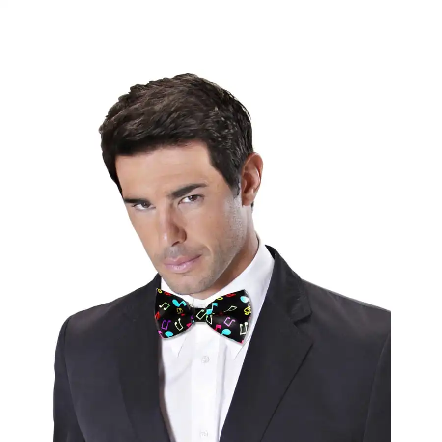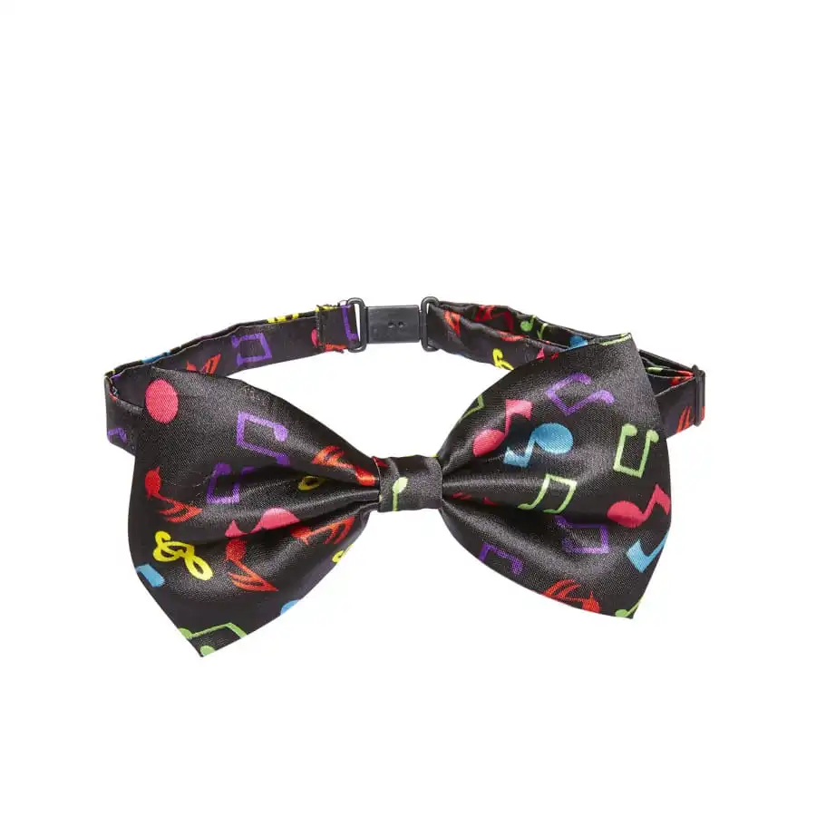 Le noeud papillon noir décoré de notes de musique multicolores est un accessoire unisexe original.