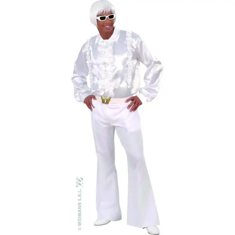 Pantalon disco pattes d’Ă©lĂ©phant extensible de couleur blanc, pour homme. Avec cet accessoire, vous n’aurez aucune difficultĂ© Ă complĂ©ter une tenue basĂ©e sur un thème disco ou annĂ©es 70-80.