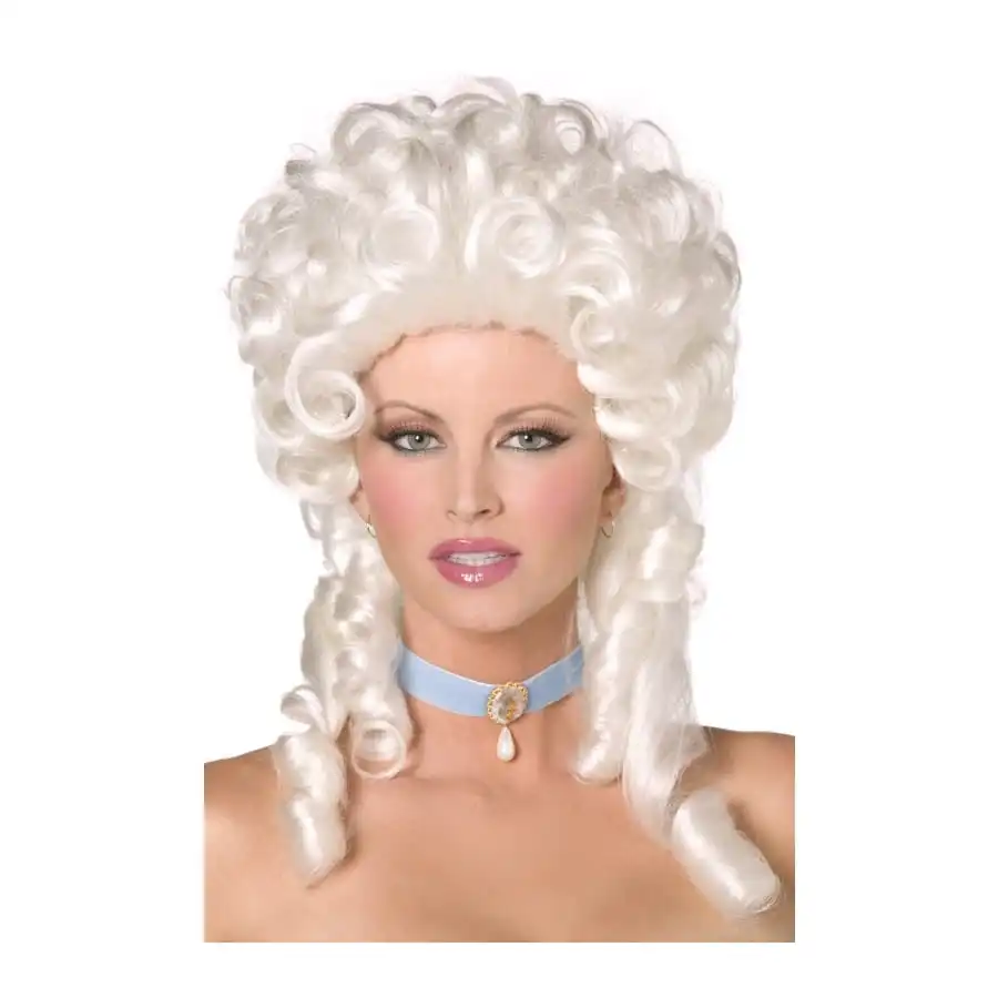 Perruque baroque de couleur blond platine pour femme. Cet accessoire est composĂ© d’une multitude de boucles très soigneusement coiffĂ©s en un chignon avec des mèches sur le cou. Utilisez-la pour un dĂ©guisement de marquise ou de personnage mĂ©diĂ©val.