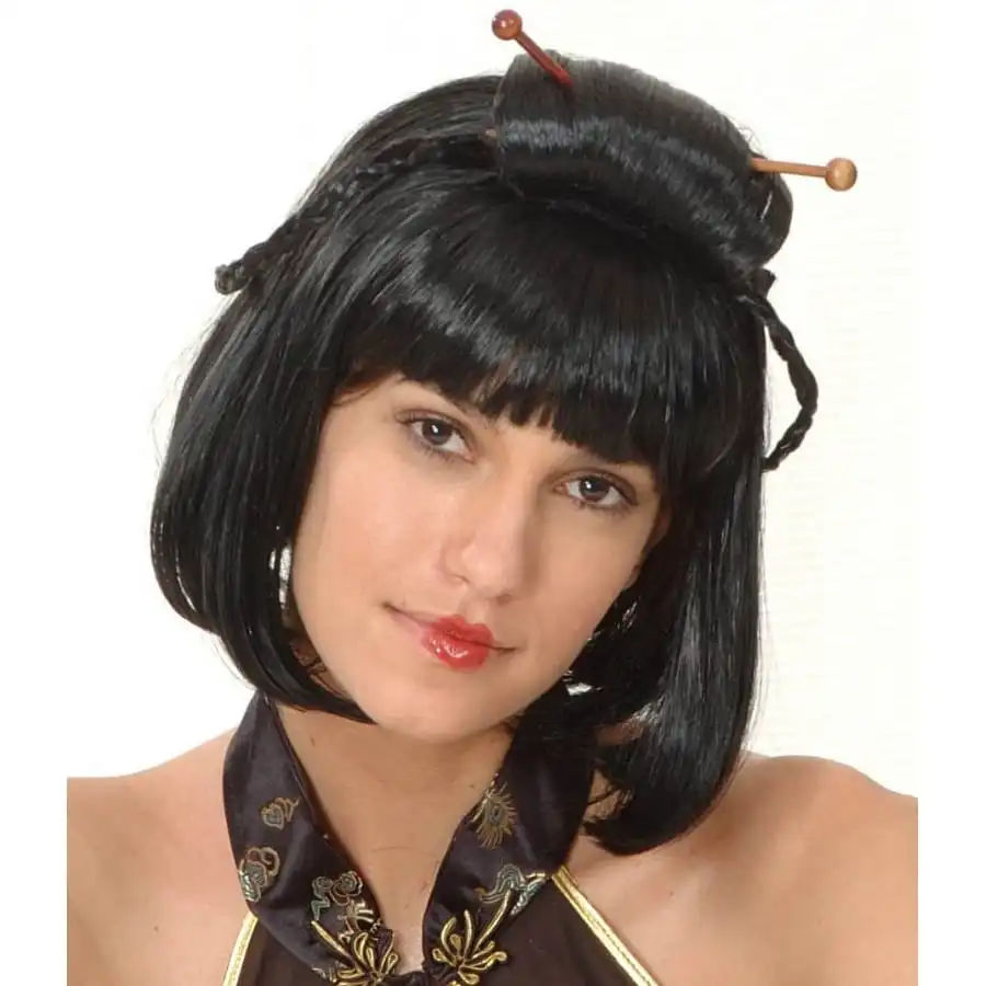Les coiffures avec montages sont très difficiles Ă rĂ©aliser soi-mĂŞme mais pour vous faciliter la tâche, nous vous proposons cette perruque carrĂ© chinois noir avec montage, destinĂ©e aux femmes. Le montage est maintenu au-dessus de la tĂŞte Ă l’aide de deux baguettes en bois et deux jolies tresses viennent ajouter du charme Ă cette coiffure complexe. Cette perruque est idĂ©ale pour un dĂ©guisement asiatique.