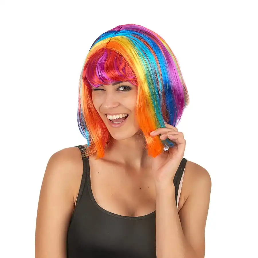 Apportez une touche de couleur à vos déguisements grâce à la perruque carré multicolore frange et raie centrale.