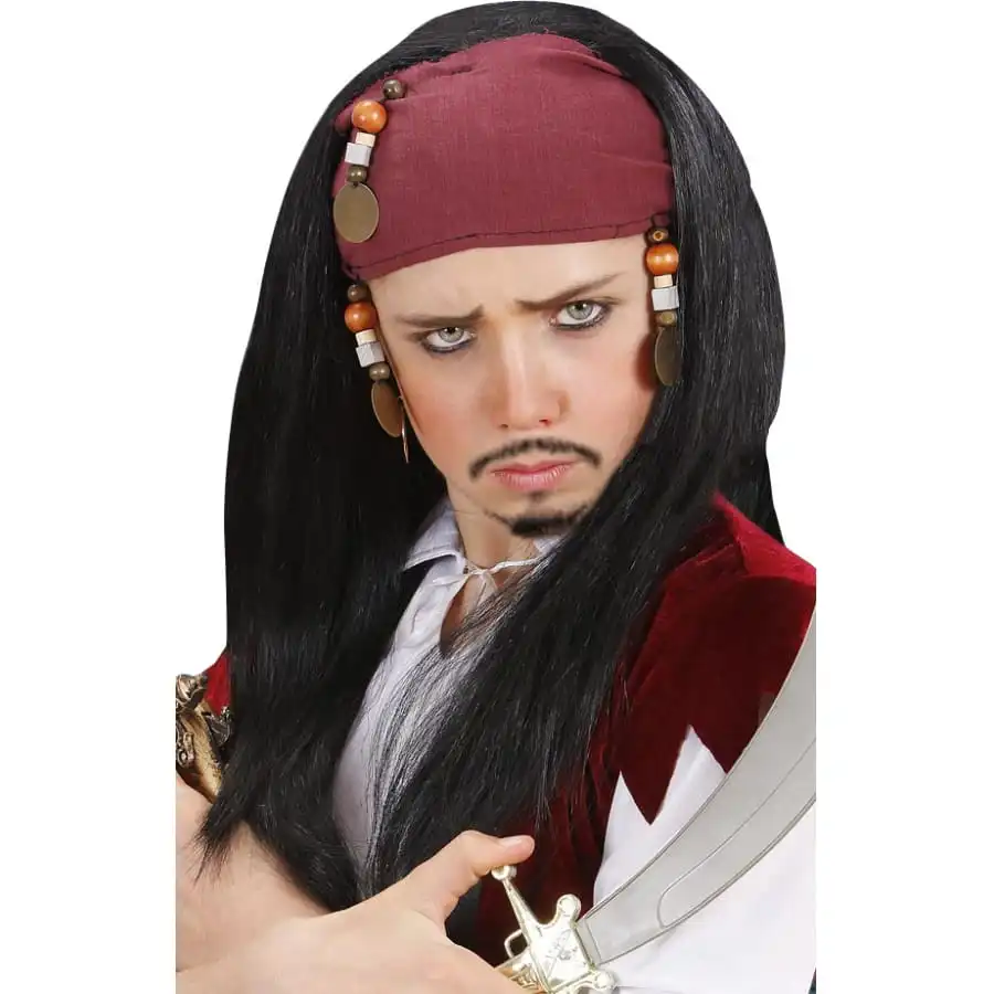 Pour ĂŞtre le parfait il lui faut aussi la perruque, tous ses amis seront bluffer par son dĂ©guisement. Cette perruque de pirate est noire et elle arrive Ă mi dos, les cheveux sont lisses. Cet accessoire est aussi composĂ© d’un bandeau de couleur bordeaux.