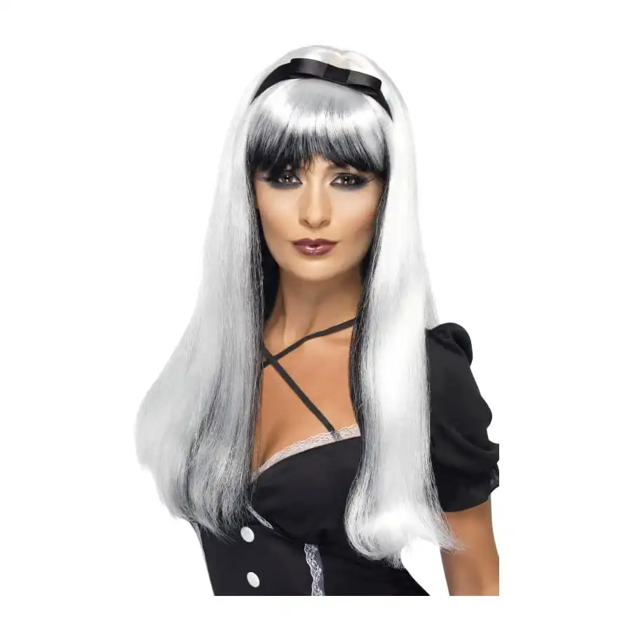 Perruque de sorcière de couleur noire et argentĂ©e, pour femme. La perruque est composĂ©e de longs cheveux droits et de mèches noires en-dessous. Elle donnera un effet glacial et gothique Ă la fois, idĂ©al pour un dĂ©guisement de sorcière Ă l’occasion d’Halloween.