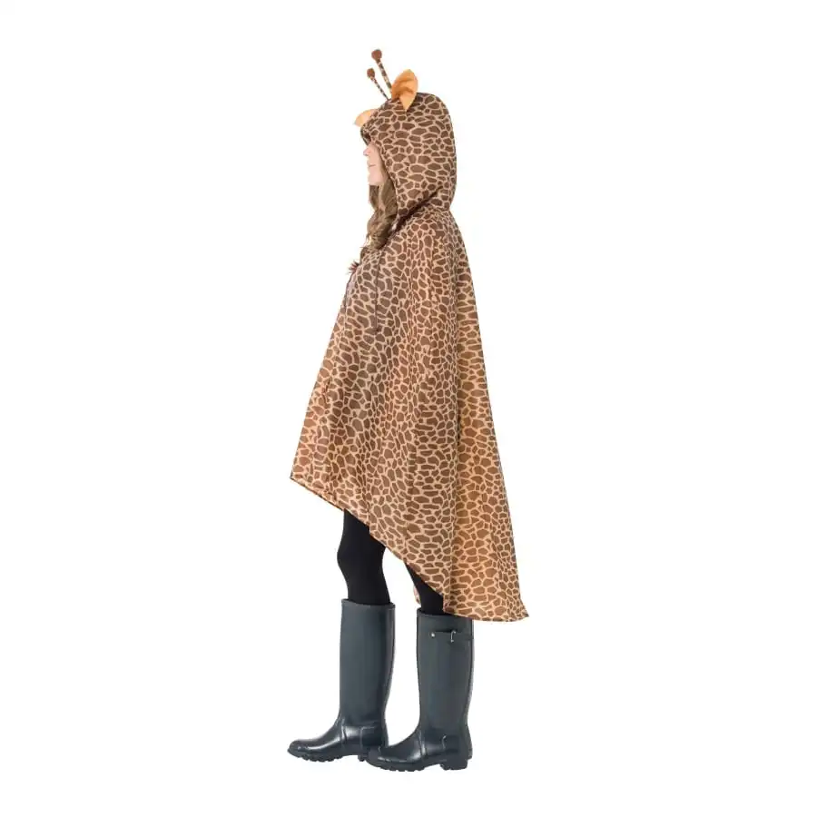 Vous n’avez peut-ĂŞtre pas son long cou, mais vous avez assurĂ©ment sa couleur de peau ! Vous allez incarnez une belle girafe des savanes africaines avec ce poncho beige tachetĂ© de marron. Vous disposerez mĂŞme d’une capuche avec des oreilles et des cornes. Ce poncho est impermĂ©able, et est dotĂ© d’un sac Ă cordons. Il est proposĂ© en taille unique, pour homme ou femme.