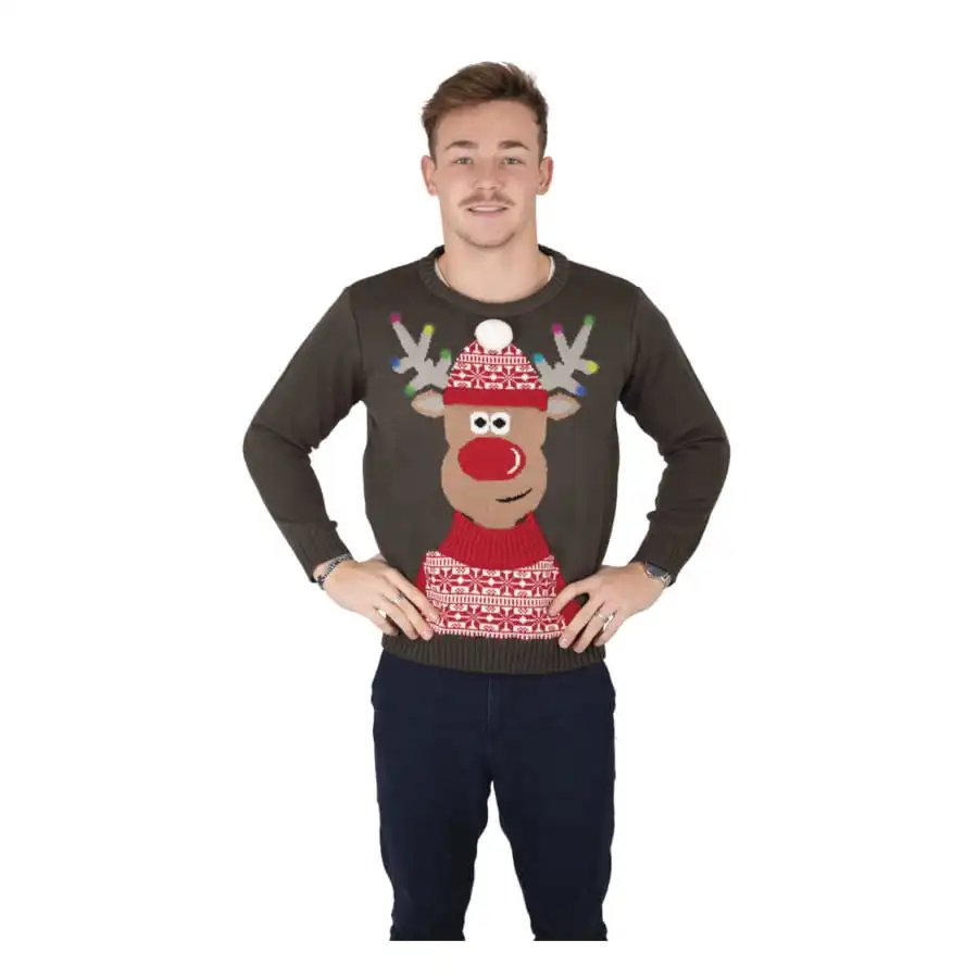 Entrez dans la pĂ©riode des fĂŞtes de fin d’annĂ©e avec humour et joie de vivre en arborant le pull de NoĂ«l renne lumineux et sonore.