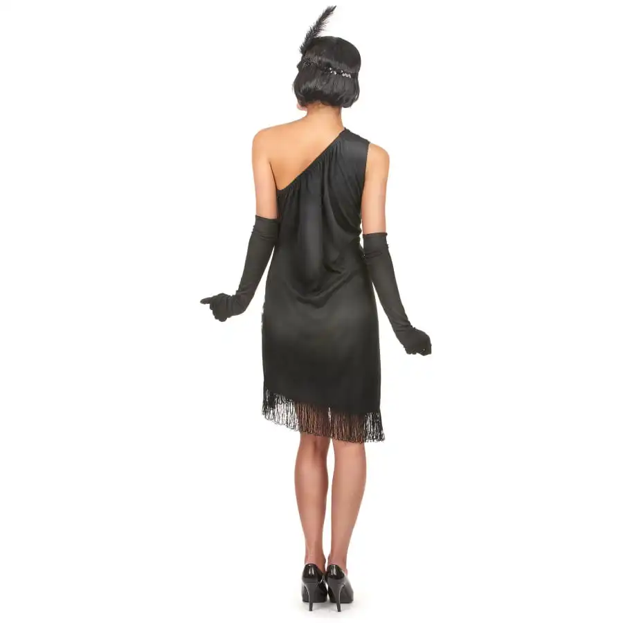 Une paire de longs gants de couleur noire viendra habiller vos mains, et un bandeau noir à plumes viendra agrémenter votre coiffure.