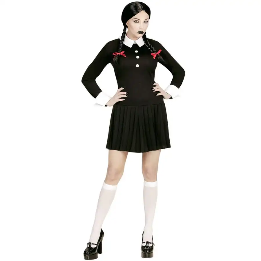 Ce dĂ©guisement de Mercredi Addams sera parfait pour entrer dans la peau d’une Ă©colière tĂ©nĂ©breuse Ă l’occasion d’Halloween.