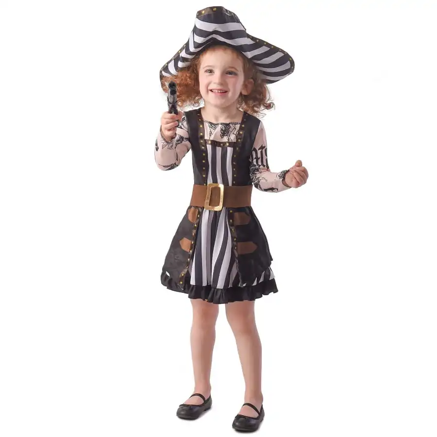 La plus terrible des pirates est prête pour son Halloween, avec la robe de fille pirate avec bras tatoués.