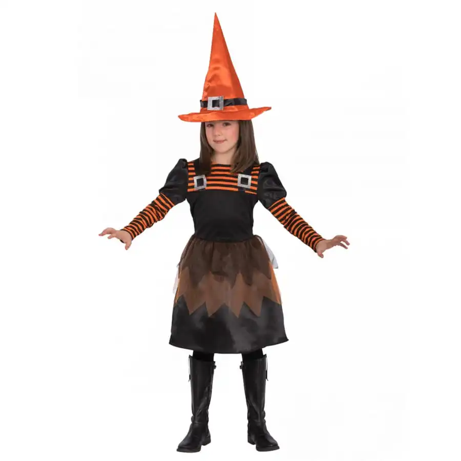 Votre fille sera fin prête pour la chasse aux bonbons, avec la robe de petite sorcière orange et noir.