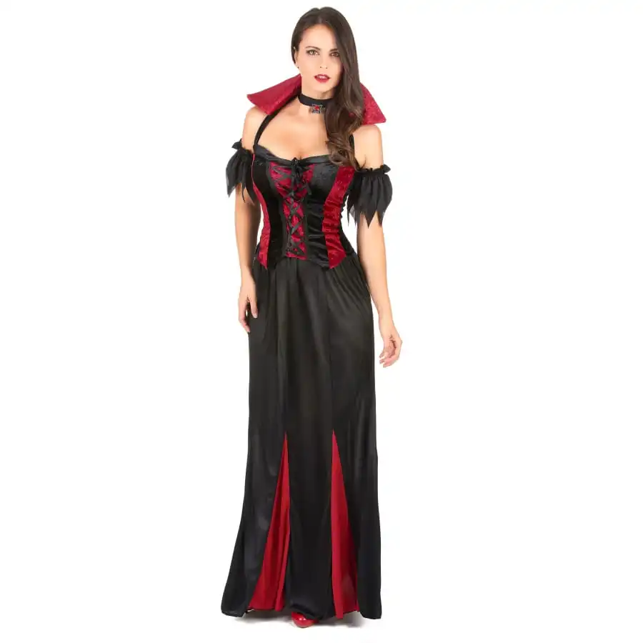 Il faut reconnaĂ®tre que parmi tous les dĂ©guisements d’halloween, ceux des vampires ont une classe naturelle. C’est le cas de cette robe de vampiresse Ă grand col rouge pour femme que vous pouvez commander sur notre site. Elle est formĂ©e d’un bustier rouge et noir, dĂ©corĂ©e par un corsage sur le devant. A ce bustier se trouve rattachĂ© un col montant de couleur rouge, ainsi que deux brassards. Le costume s’accompagne aussi d’un collier Ă strass maintenu par un ruban noir. La tenue comprend aussi une longue jupe noire, avec une touche de rouge au niveau des fausses fentes. Elle est pourvue d’un Ă©lastique Ă la taille pour offrir un confort et un meilleur ajustement.