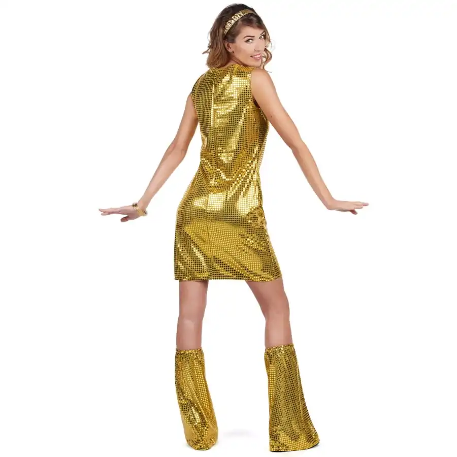 Mettez le feu sur une piste de danse style années 70 avec cette étincelante robe Disco dorée et guêtres avec sequins.