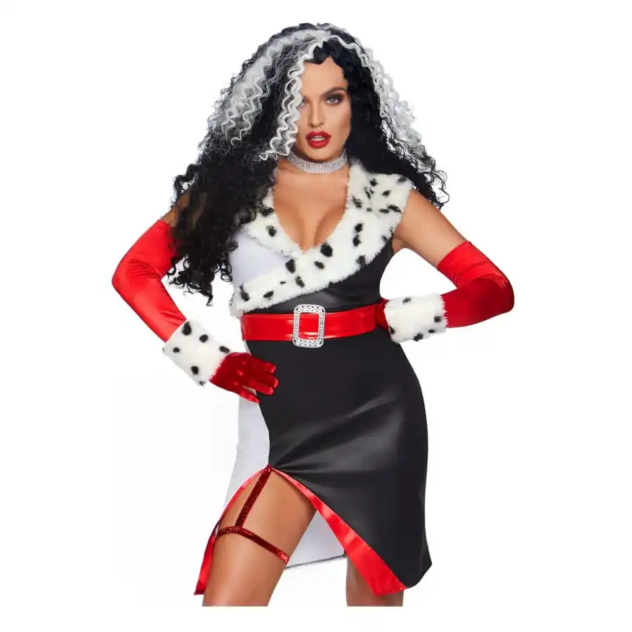 Son dĂ©colletĂ© est plongeant et son encolure imite le pelage et les motifs blancs et noirs d’un dalmatien.