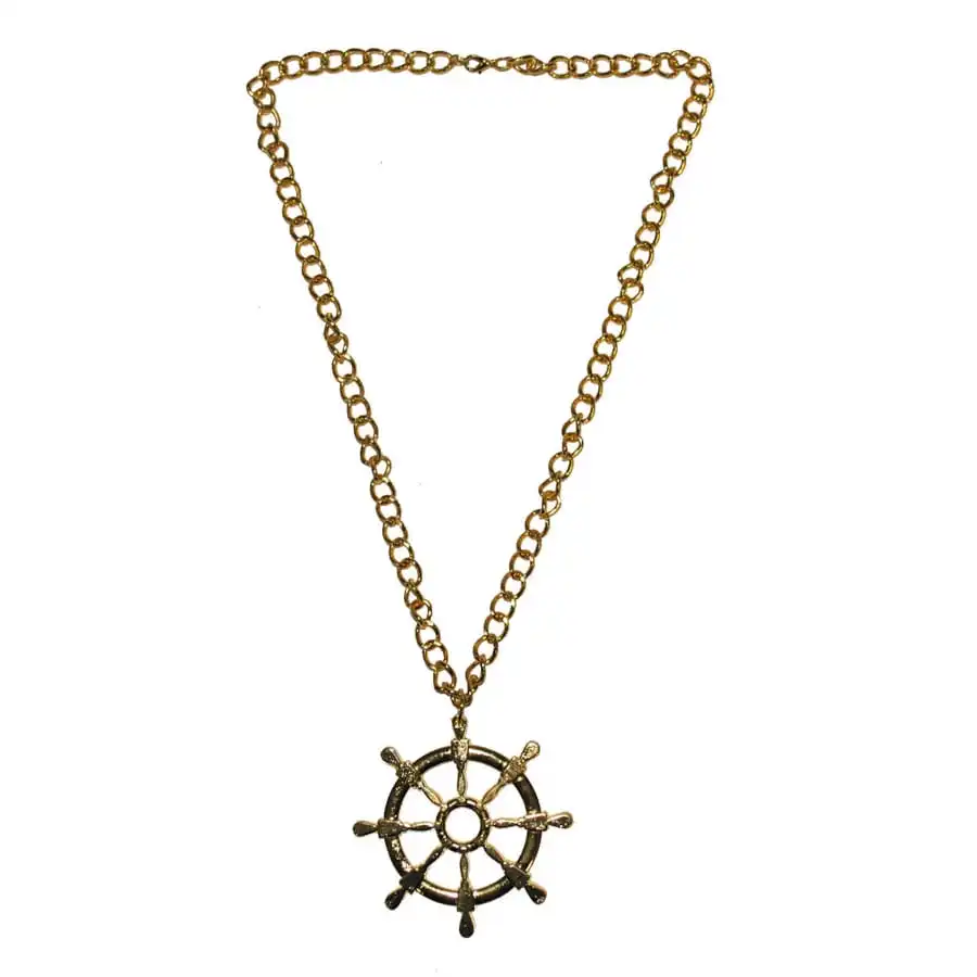 Il n’y a rien de mieux pour accessoiriser votre dĂ©guisement de femme marin que ce sautoir dorĂ© avec pendentif gouvernail pour adulte.