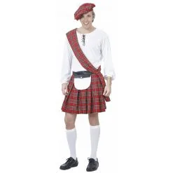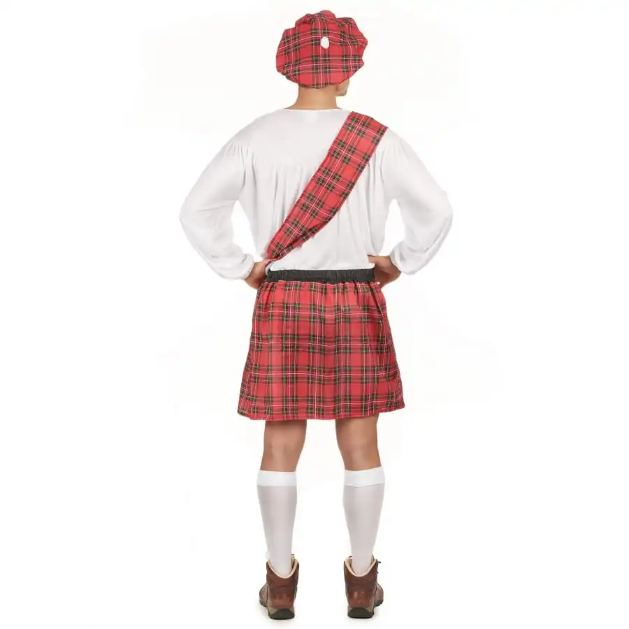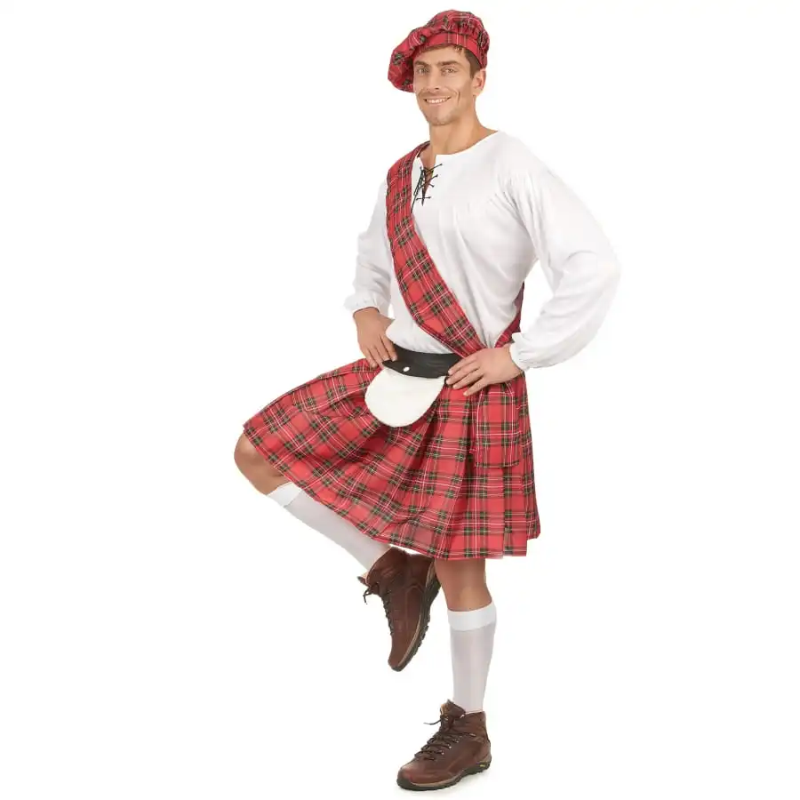 Pour l’une de vos soirĂ©es dĂ©guisĂ©es, essayez cette tenue d’Ă©cossais pour homme adulte. Elle est constituĂ©e d’un chemisier blanc Ă encolure tunisienne Ă oeillets, fermĂ©e par un lacet noir. Celui-ci est Ă manches longues en ballon resserrĂ©es aux poignets, et est fait d’un tissu lĂ©ger et fluide. Nous avons ensuite la jupe ou le kilt typique de la tenue, Ă carreaux rouges, Ă©lastique Ă la taille et allant Ă hauteur des genoux, avec une fausse poche en noir et blanc cousue Ă sa taille. Enfin, un bĂ©ret et une Ă©charpe assortis au kilt finaliseront le dĂ©guisement, l’Ă©charpe se portera en diagonale puis se nouera sur le bas-cĂ´tĂ©. Le port de longues chaussettes rendra le tout encore plus original.