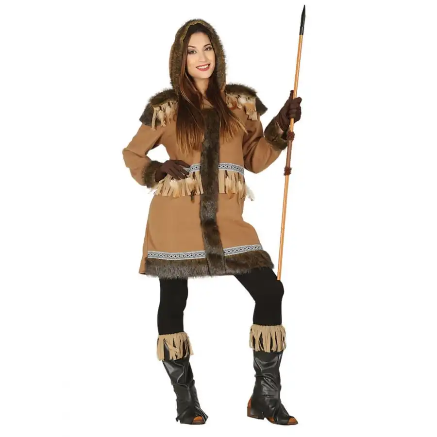Pour finir, une capuche est cousue directement Ă l’encolure et possède Ă©galement une bande de fourrure factice Ă l’avant pour imiter Ă merveille la tenue portĂ© par les femmes esquimaux.