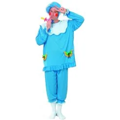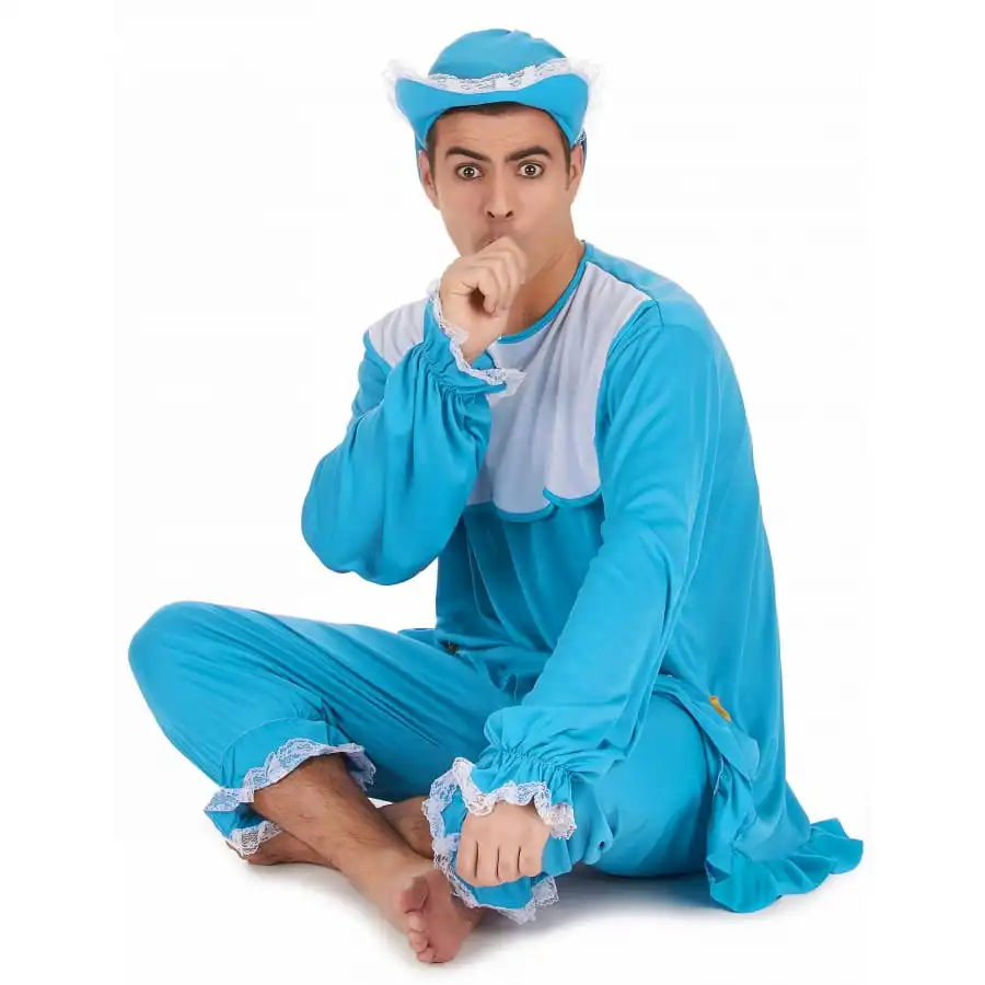 Faire son gros bébé est un terme qui peut être employé à la lettre. Devenez le centre d’attention lors de votre soirée d’enterrement de vie de garçon. Enfilez sans plus attendre votre tenue de bébé bleu pour homme adulte. L’article comprend un haut bleu à manches longues, équipé d’élastiques aux extrémités pour un effet bouffant. Deux petites poches de couleur verte et jaune ont été cousues sur chaque côté. Le vêtement est ample et décoré de froufrous au niveau des manches, du col et sur le bas du tee-shirt. Le déguisement inclue également un pantalon de couleur assortie, à taille élastique, et également orné de quelques froufrous. Sa longueur descend jusqu’à mi- mollets. La tête du gros bébé sera couverte d’une coiffe bleue avec visière semi rigide cousue de dentelle. Elle se noue tout simplement à l’arrière, ce qui permet à cet accessoire de convenir à tous les tours de tête.